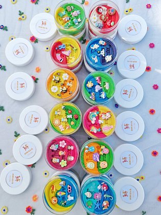 Hravá plastelína je kombinace dvou barev se třpytkami a figurkami. Plastelína je 100% netoxická, vyrobená z jedlých surovin a pro barvení a aromatizování bylo použito výhradně potravinářských barviv a aromat.
